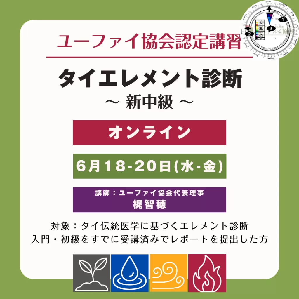 2025年6月18-20日(水-金)オンライン:タイエレメント体質診断~新中級~